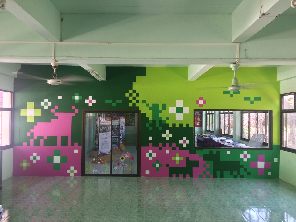 Detail: โปรเจคนี้ได้รับการทาบทามจากรุ่นพี่ ให้มาสร้างสรรค์งานที่ห้องสมุด โรงเรียนร่องตาทีวิทยา จังหวัดอุทัยธานี โดยมีโจทย์ว่า อยากได้อะไรที่ดูเป็นป่าๆ และสัตว์ป่า เพราะโรงเรียนนี้อยู่ใกล้บริเวณเขตรักษาพันธุ์ป่าห้วยขาแข้ง ระหว่างที่ทำงาน ก็ได้มีเด็กๆนักเรียนหลายคนมาขอช่วยทาสีด้วย คงเพราะก่อนหน้านี้ทางโรงเรียนไม่มีสอนศิลปะเพราะไม่มีครูศิลปะมาบรรจุ (เพิ่งมีสอนศิลปะได้ประมาณสองปีเท่านั้น) คำว่า"ศิลปะ"จึงดูเหมือนจะเป็นอะไรที่ไกลตัวมากๆสำหรับนักเรียนที่นี่