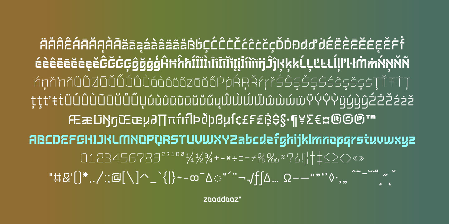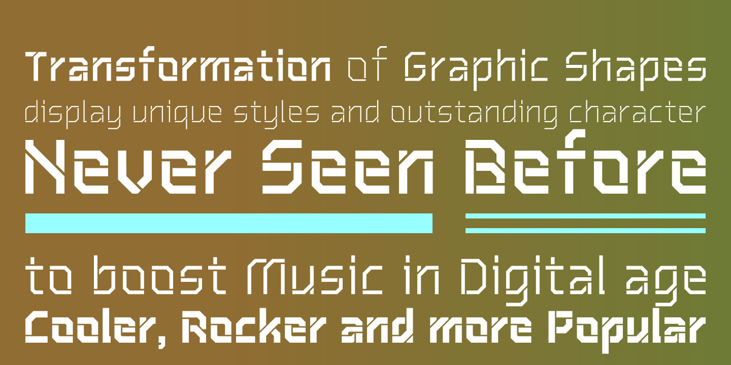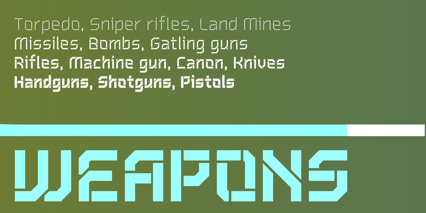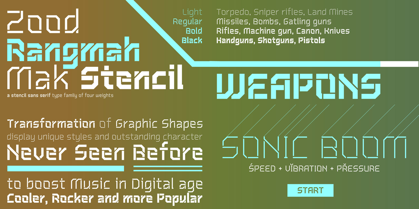 Description: Inspired by Soviet Propaganda Typeface, “ZoodRangmahMak Stencil” is a Monoline sans serif type family of four weights. It has stable and strong character appropriate for graphic design in fields of music, technology, games, motor sport and military.